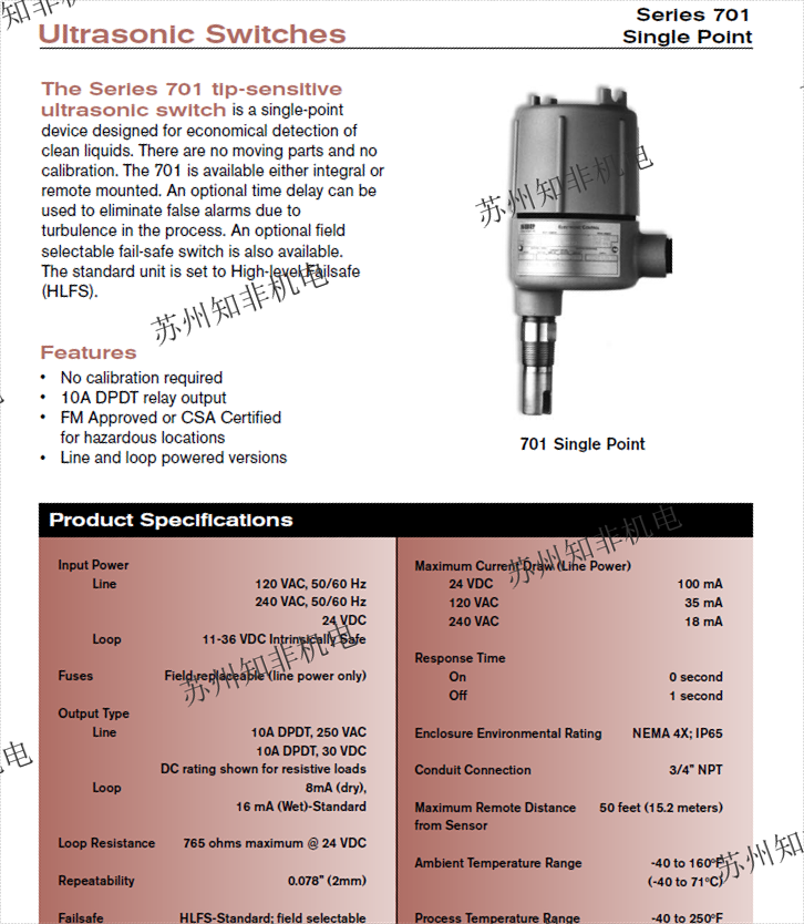 以上所有種類的開(kāi)關(guān)均可提供通用型、全天候型、防爆型開(kāi)關(guān)外殼; NPT 螺紋連接方式;適應(yīng)不同應(yīng)用場(chǎng)合的開(kāi)關(guān)單元 ;適應(yīng)不同化學(xué)介質(zhì)的多種金屬材質(zhì)。