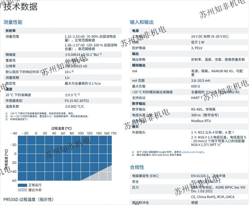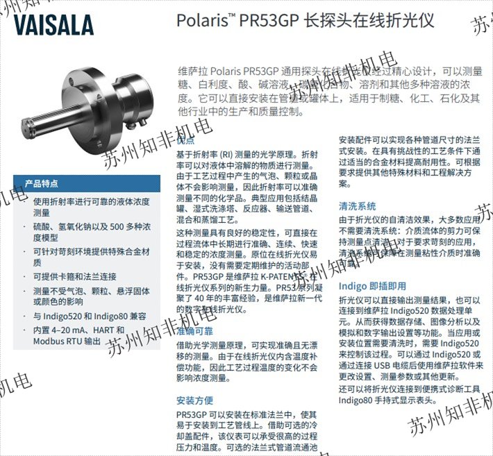維薩拉 Polaris PR53GP 探頭型在線折光儀是制糖、化工、石化和其他行業(yè)的理想濃度測量解決方案。對于高溫工況,可選擇使用冷卻蓋板。