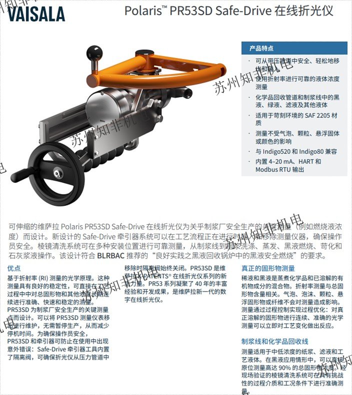 維薩拉 Polaris PR53SD 在線折光儀適用于制漿行業(yè)嚴(yán)苛的工藝條件,可測量黑液、綠液、粗漿洗滌以及其他纖維和化學(xué)品回收線中的液體濃度。